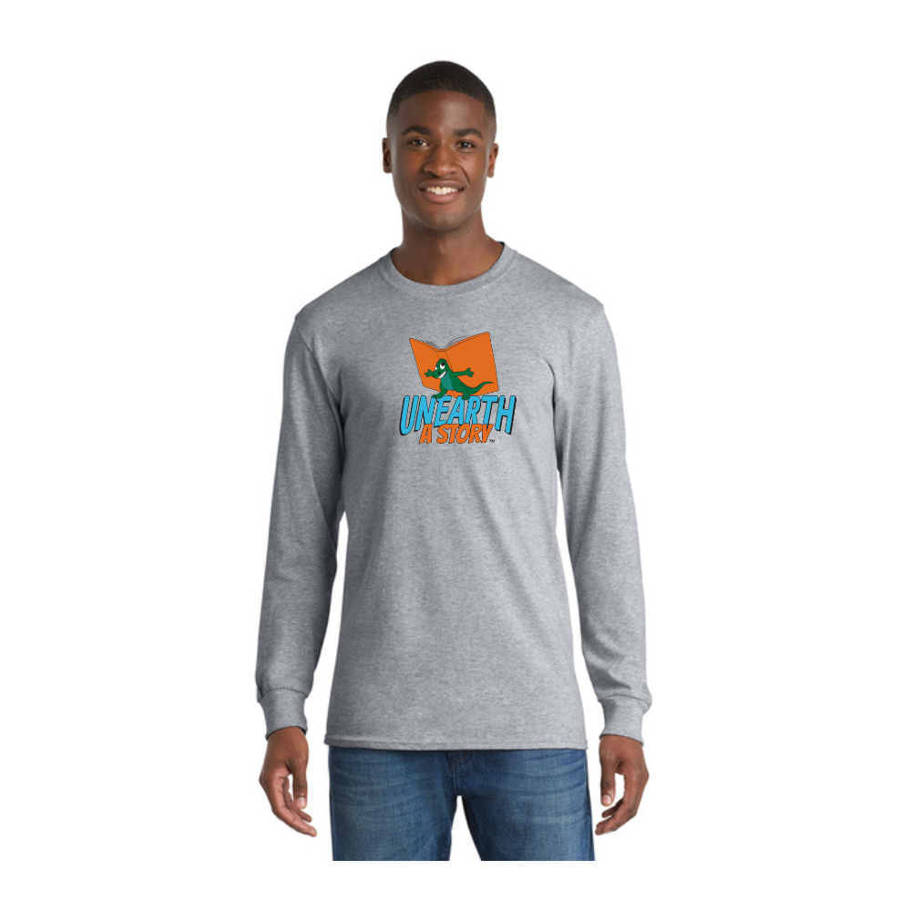 Bring a touch of fun and comfort to your summer reading program with this long-sleeved t-shirt featuring Tom Bonson’s adorable little smiling dinosaur illustration. Perfect for library staff and volunteers, this shirt showcases the cheerful dinosaur holding open a book—an instant reminder that summer is the perfect time to “Unearth a Story.”
