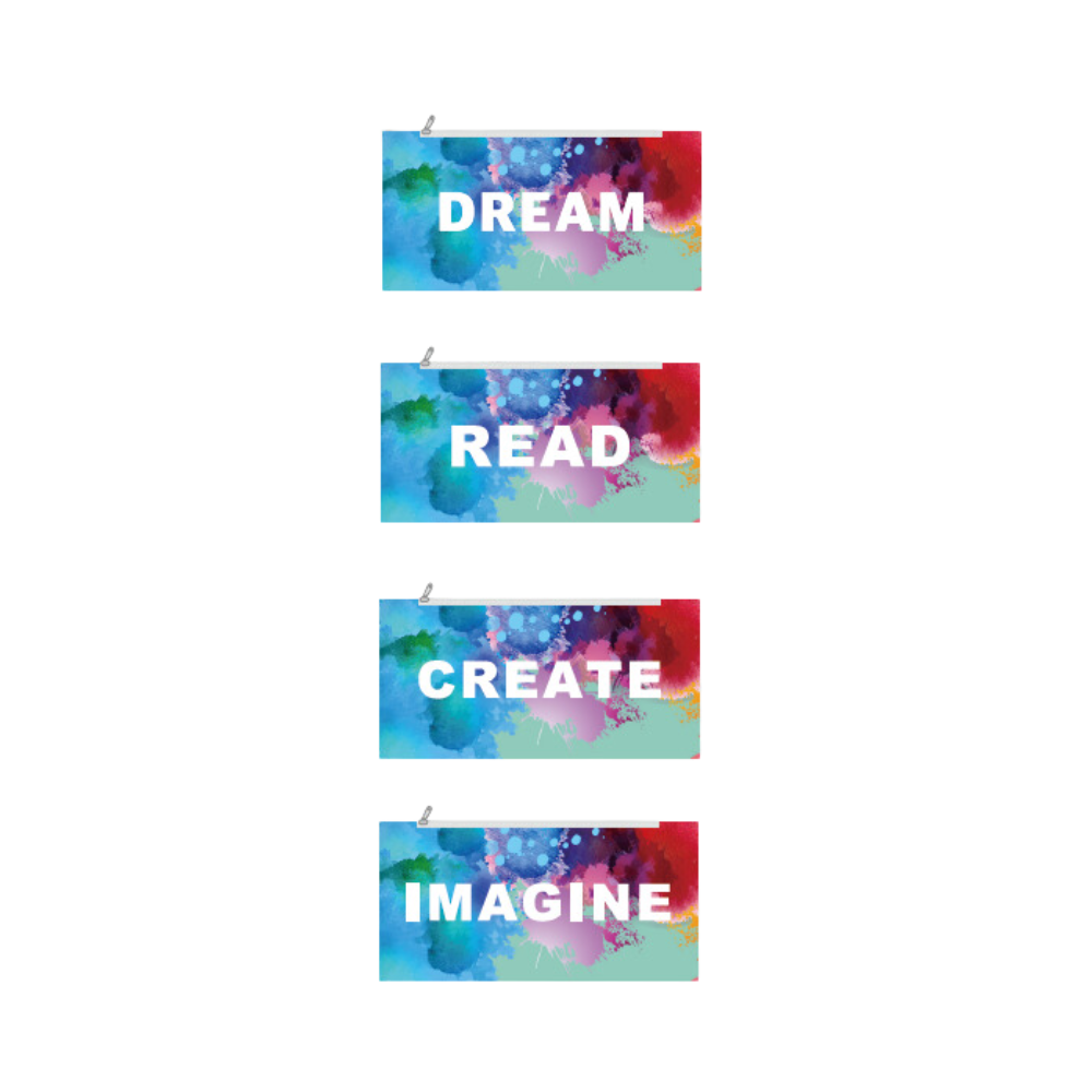 Dream, Read, Create, Imagine with these brightly colored watercolor zipper pouches, perfect for those art supplies!