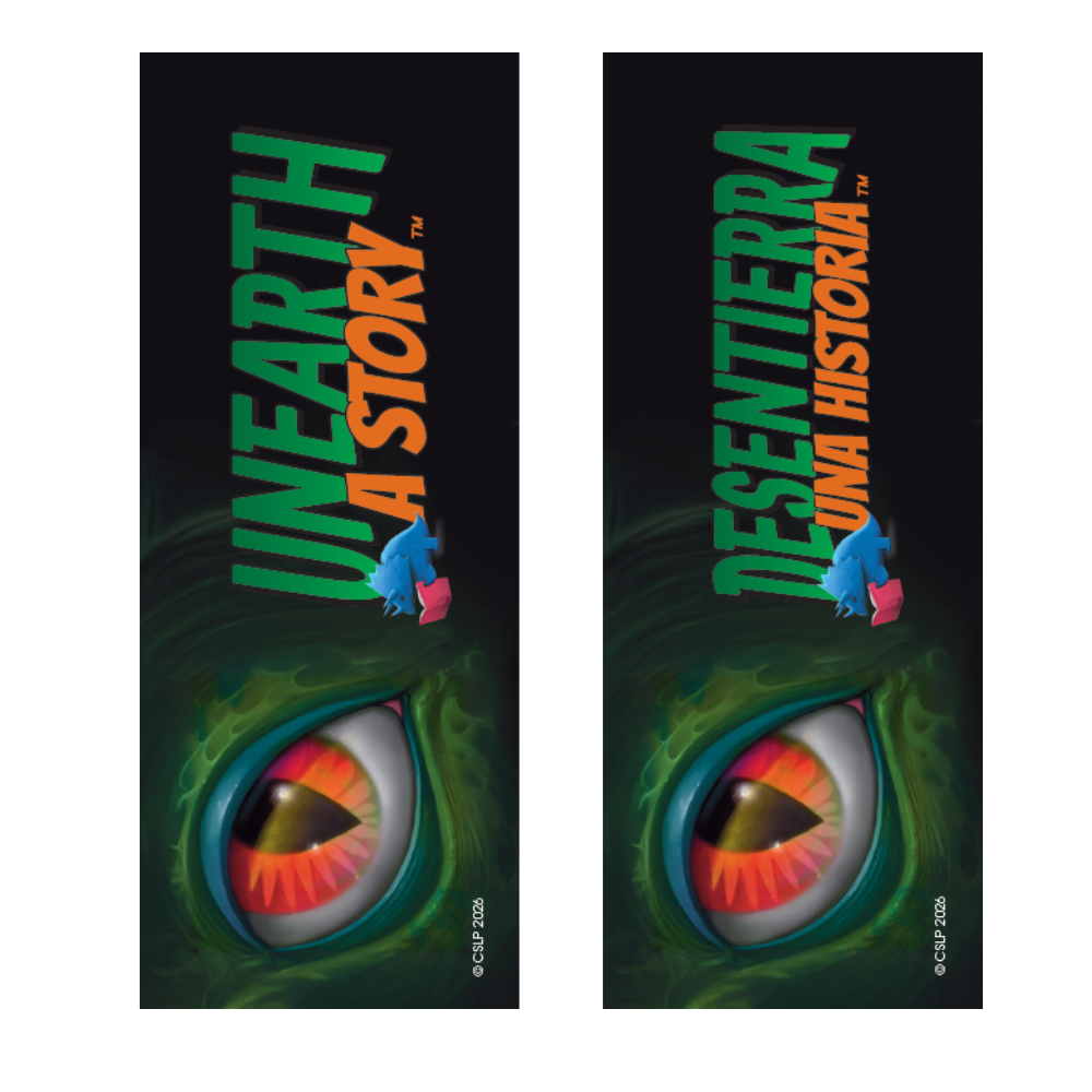 Mark your place in adventure with these bold Unearth a Story double-sided bookmarks! Each bookmark features the striking dinosaur eye artwork by Tom Bonson, paired with the 2026 slogan in both English (Unearth a Story) and Spanish (Desentierra Una Historia). Perfect for readers of all ages, these bookmarks are an affordable and eye-catching giveaway to keep your summer reading theme alive in every book.