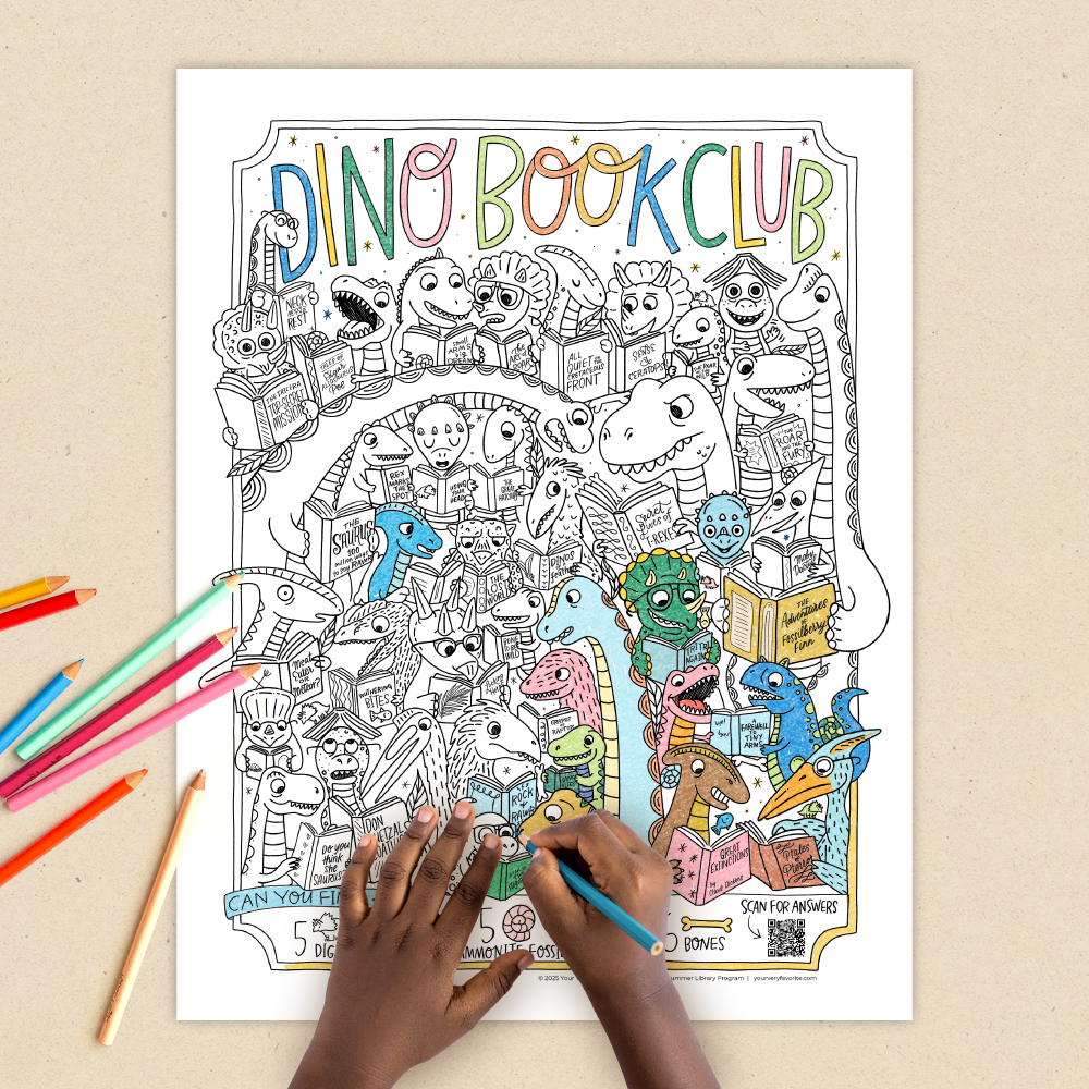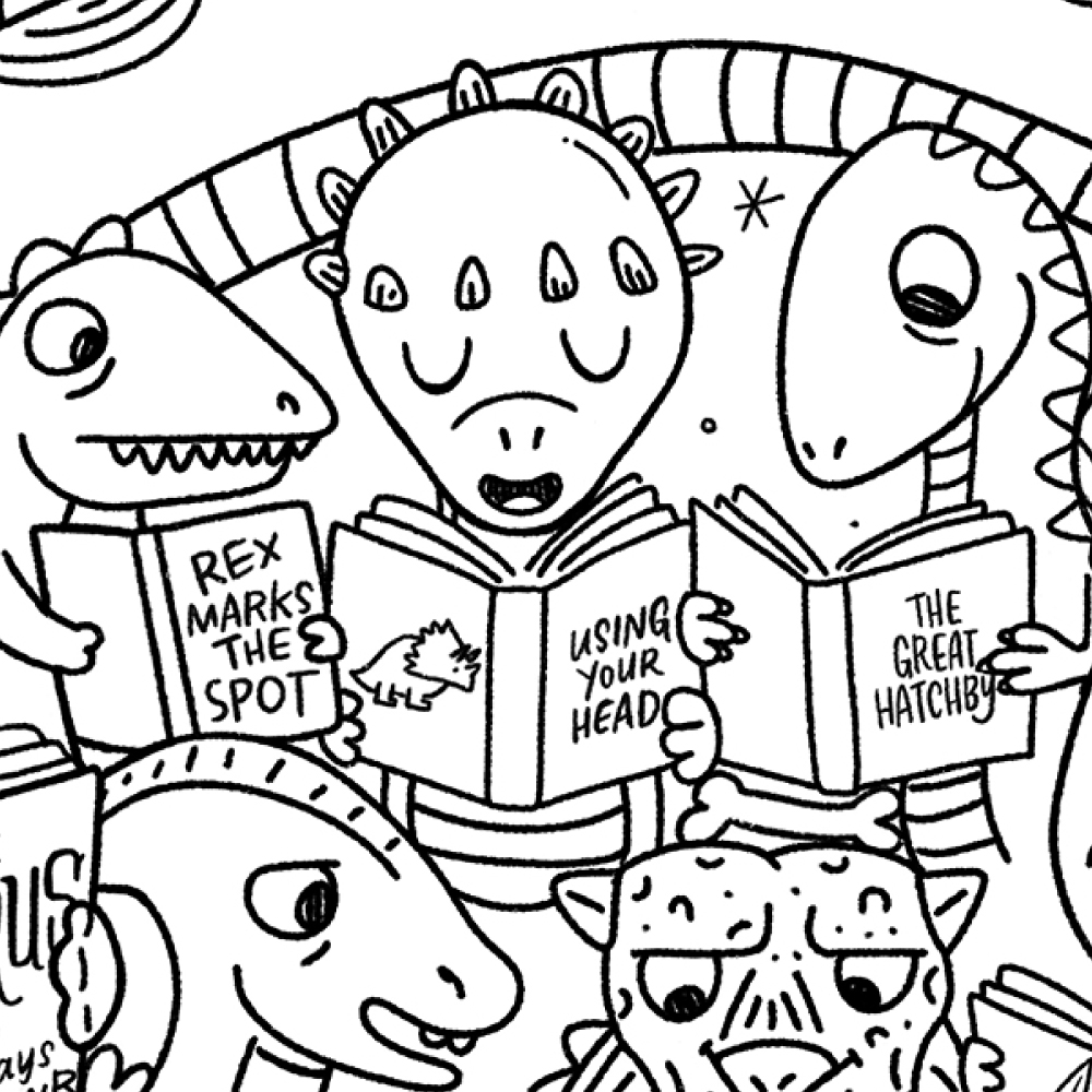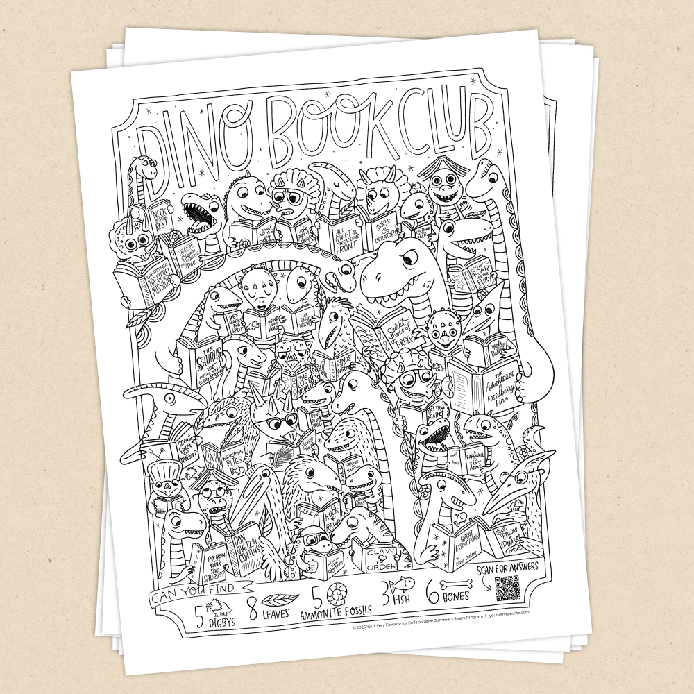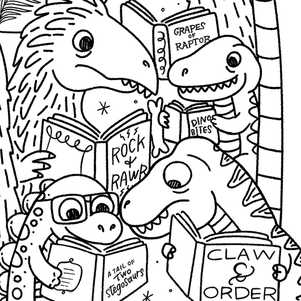 Join a friendly group of dinosaurs at their book club! This oversized 17 x 22-inch coloring poster is filled with endearing dinosaurs reading cleverly titled favorites like Grapes of Raptor and A Farewell to Tiny Arms. With so many details to discover, plus a built-in seek-and-find activity, patrons of all ages will enjoy their time exploring and coloring.