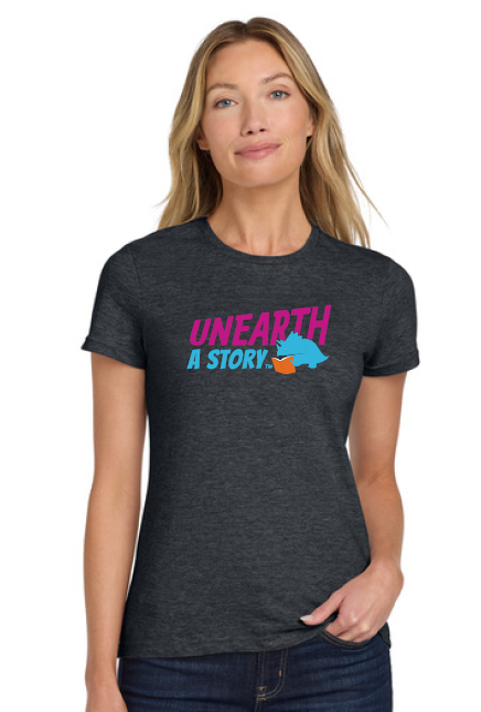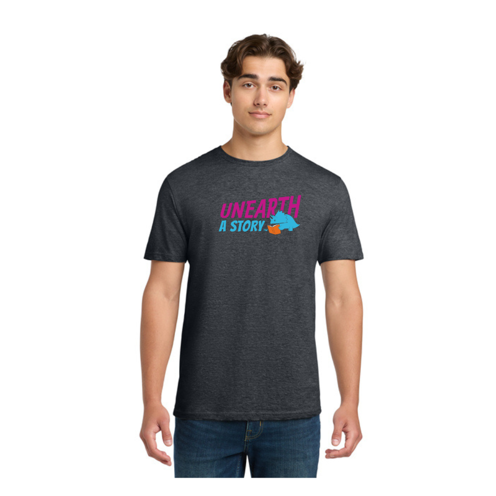 Unearth a Story(tm) with Digby, our 2026 summer reading Triceratops mascot! This t-shirt comes in unisex and women’s styling with a wide range of sizes. The color is dark heather.