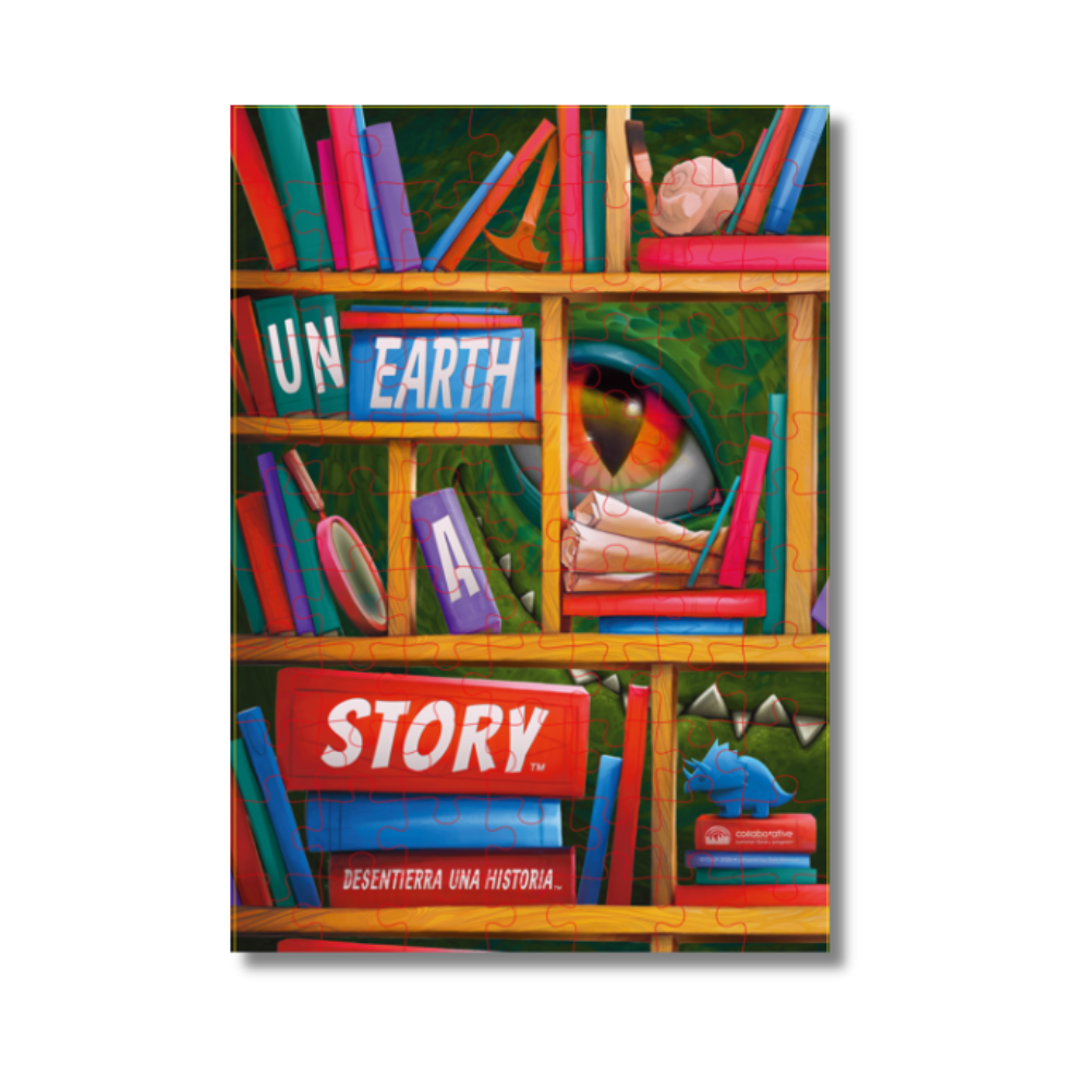 Our Unearth a Story ™ multigenerational puzzle features the vibrant official poster design with its colorful bookshelf and watchful dinosaur eye. A fun and engaging way to bring people of all ages together at the library or at home!