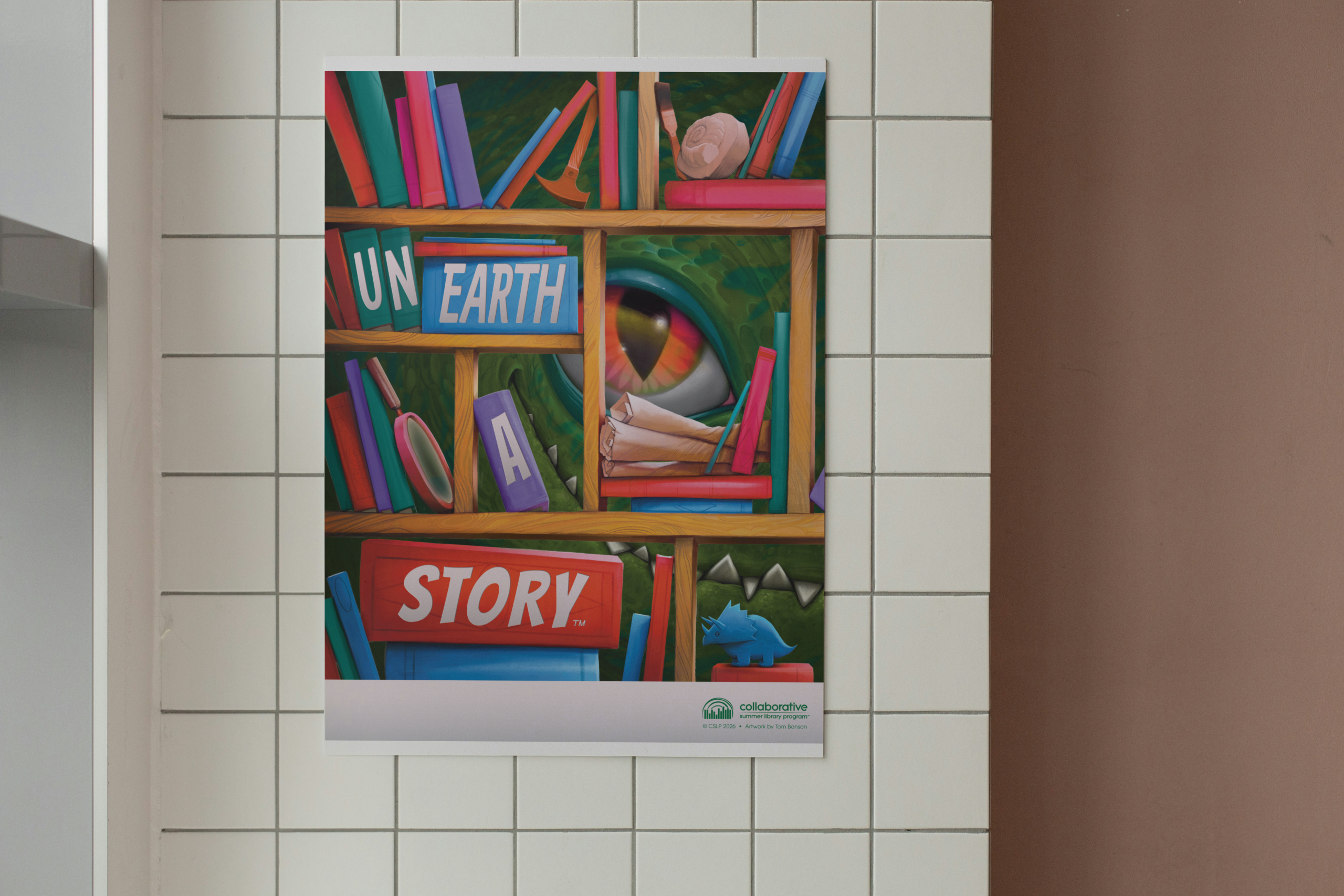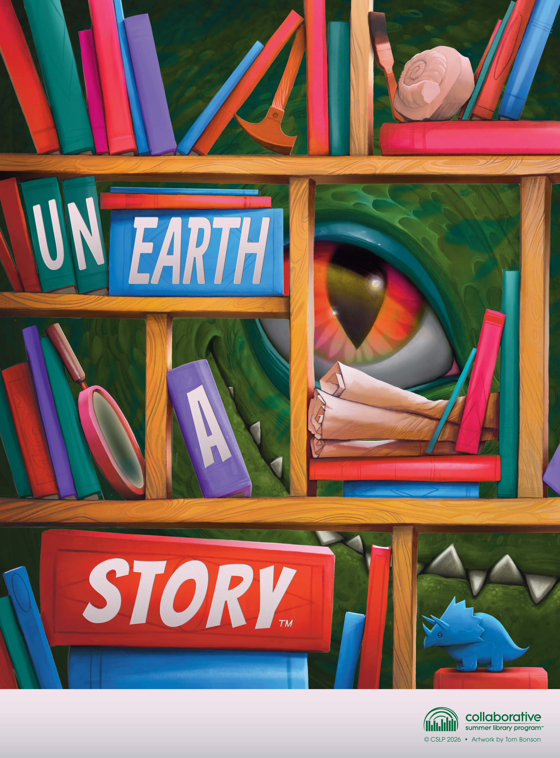 What’s lurking behind those shelves of fossils, books and archaeological tools? It’s a smiling dinosaur! This poster with its intriguing all-ages design by Tom Bonson is sure to pull viewers in. The English slogan, Unearth a Story ™, is cleverly adorning the book spines on the shelves. Can you find Digby, our triceratops mascot for 2026?