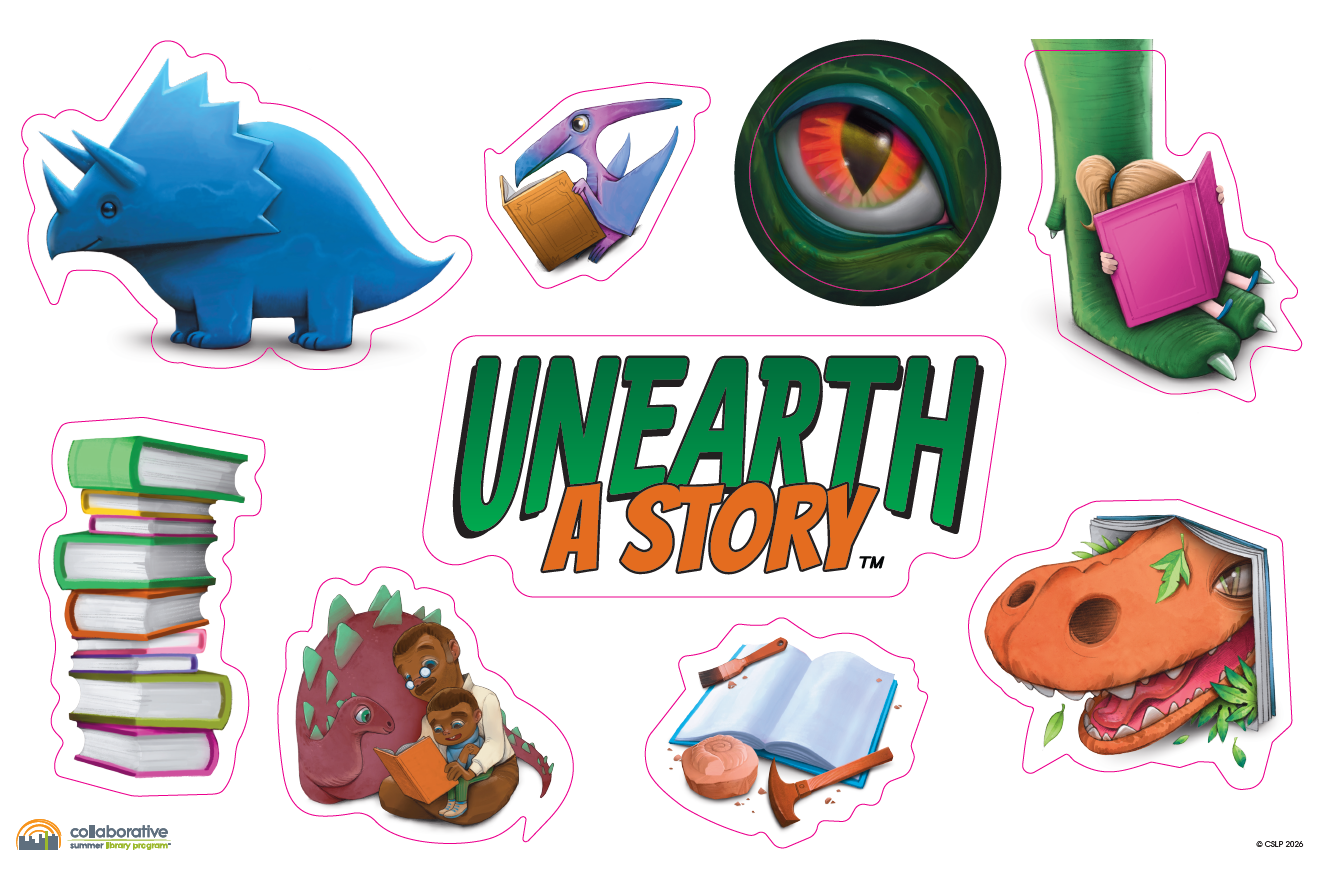 Bring dinosaur excitement and discovery to your library with this set of stunning window clings by artist Tom Bonson, created exclusively for our Unearth a Story ™ summer reading program. Perfect for windows, glass doors, or display cases, these vibrant clings transform any space into a welcoming invitation to dig into books.